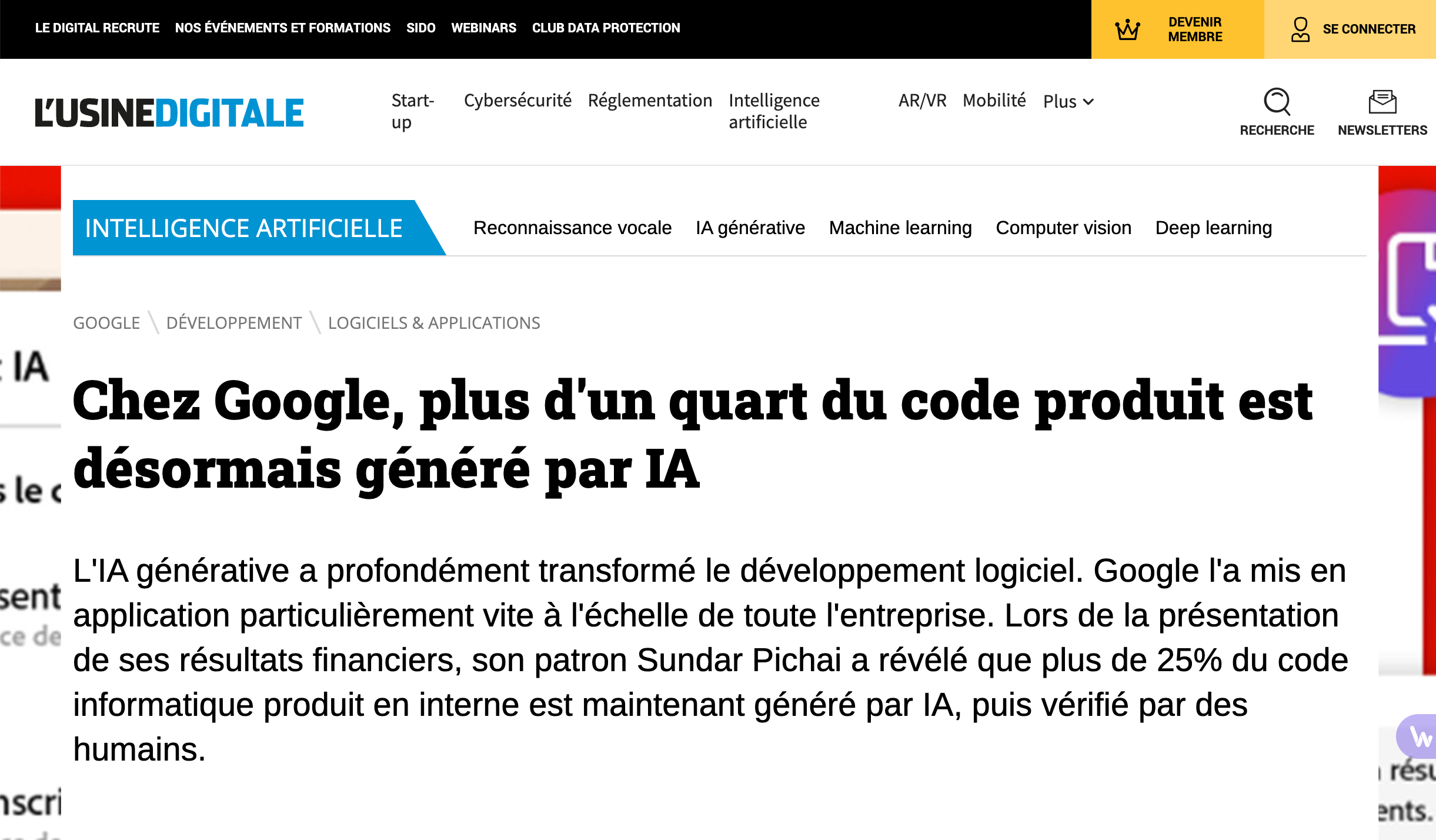 L’information diffusée par le patron de Google / Alphabet Sundai Pichar lors de l’annonce des résultats financiers de l’entreprise, et reprise par Usine Digitale le 31 octobre dernier, selon laquelle 25% du code serait écrit par une IA chez Google, a marqué les esprits.